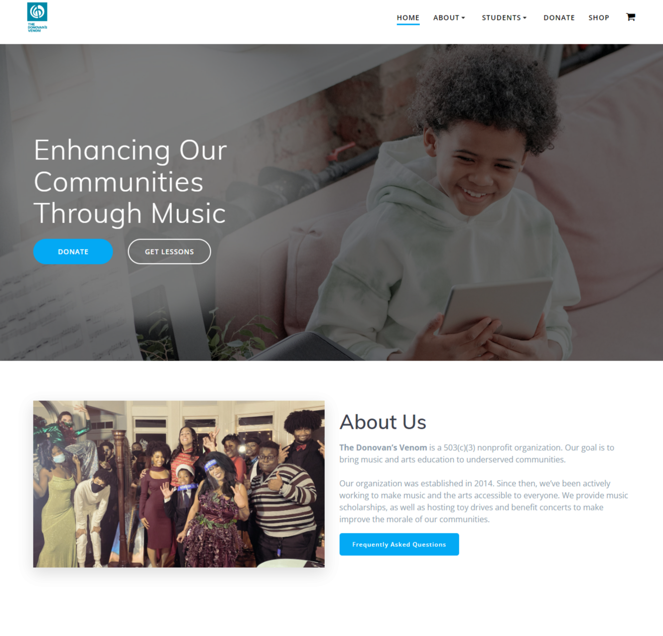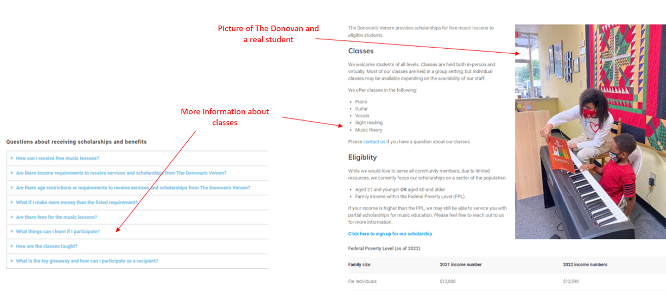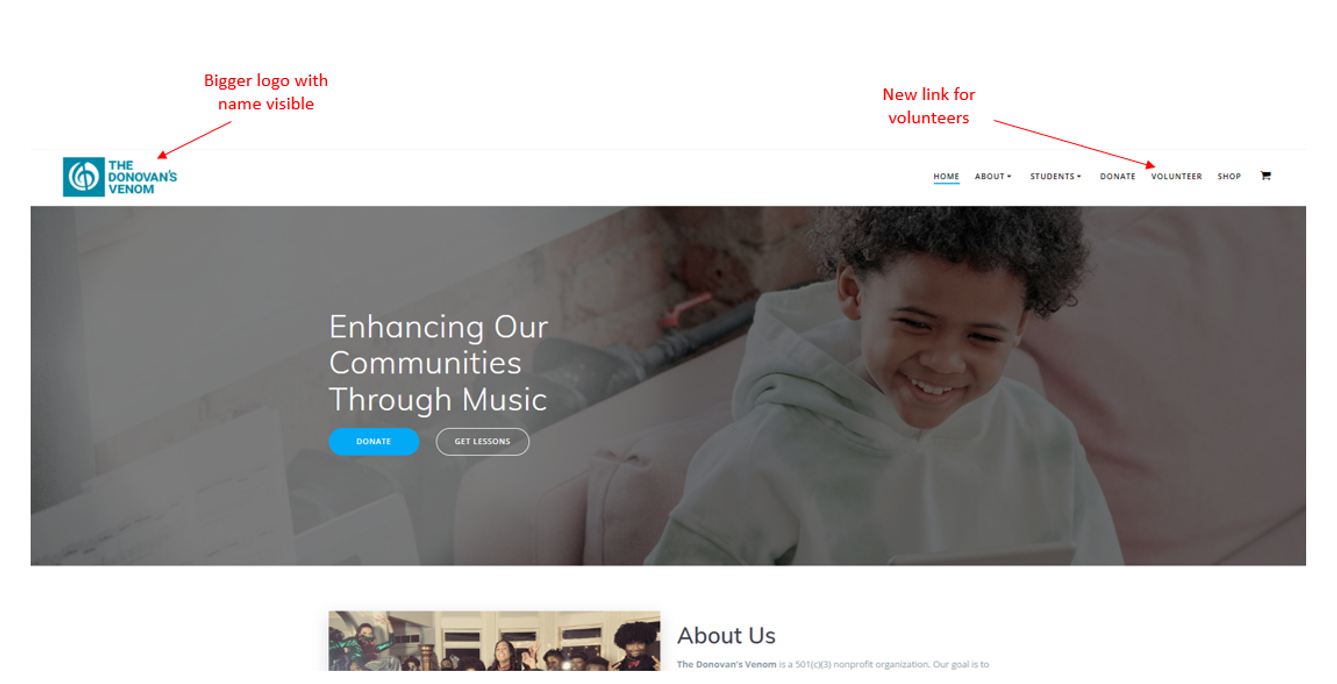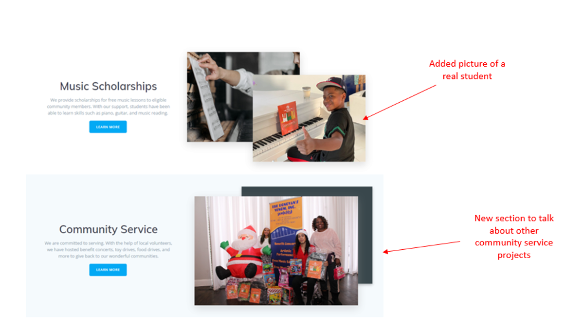 Created the copy “Enhancing our communities through music” to clearly state the organization’s work with a header photo of someone who could be a student.