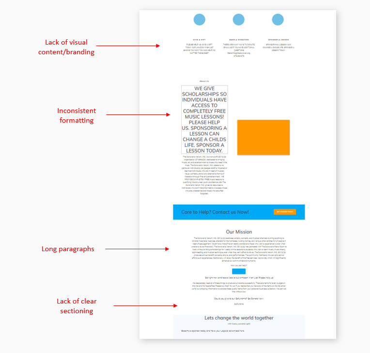 The Donovan needed a website that could communicate his nonprofit’s mission to potential donors, volunteers, and students. The one already set up had quite a few issues as seen in the photo below.