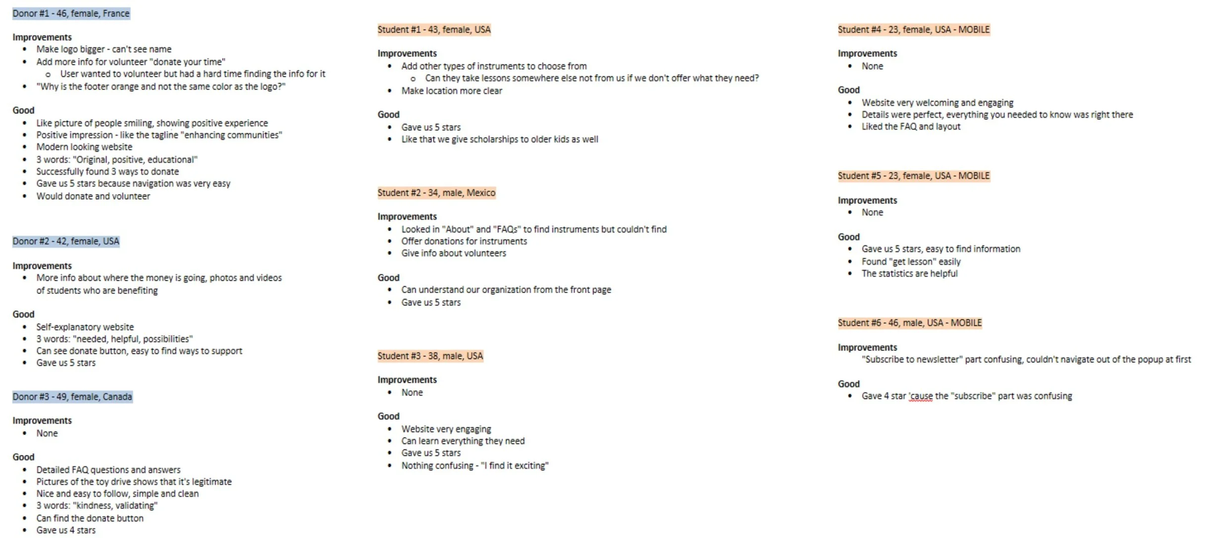 The responses were overwhelmingly positive. Below are the notes I took of the users’ comments. I made note of their pain points, suggestions, and positive comments.