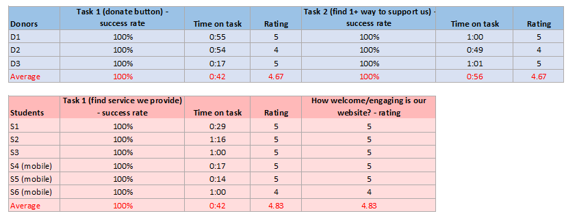 We conducted usability tests on the two identified user groups (donors and students). We worked with a total of 9 users. Three were donors, and six were students. Half of the students were tested on the mobile version.