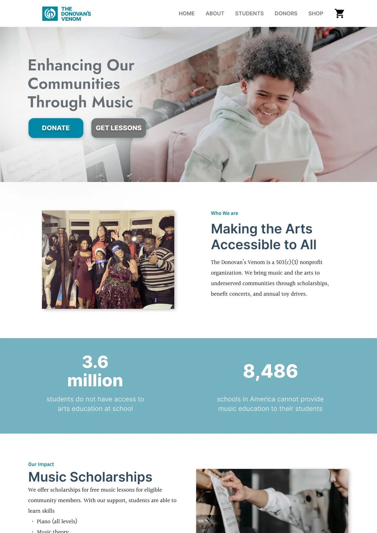 I focused on visuals relating to music, art, and community. Taking inspiration from other websites, I added stock images of children learning music and incorporated statistics to communicate our mission.